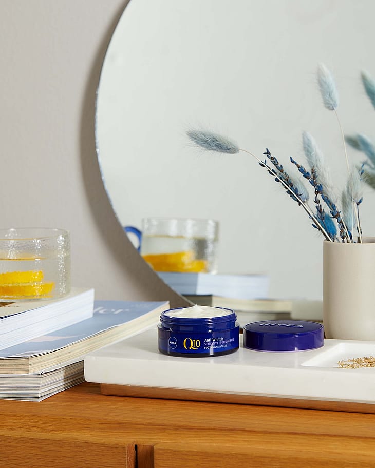 Herkälle, punoittavalle iholle kehitetty NIVEA Q10 Sensitive Perfume Free Night Cream -yövoide kosteuttaa, vähentää ryppyjä ja rauhoittaa ihoa. Se sisältää Q10:ä, luonnollista antioksidanttia, joka on 100% identtinen ihon oman Q10:n kanssa. Fermentointiprosessilla valmistettu puhdas Q10 toimii täydellisessä harmoniassa ihosi kanssa. Q10:n lisäksi tämä hajusteeton yövoide sisältää ihon punoitusta rauhoittavaa lakritsijuuriuutetta ja vähentää tehokkaasti herkän ihon kolmea tavallisinta oiretta: kuivuutta, kireyttä ja punoitusta. Tehokkaasti hoitava koostumus uudistaa ihoa yön aikana – jolloin iho parhaiten vastaanottaa kosteutusta.