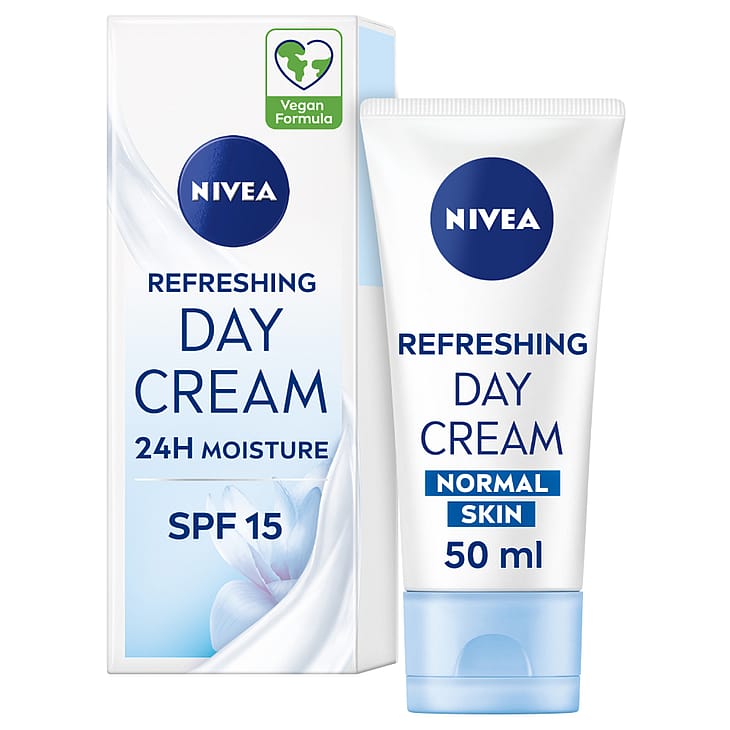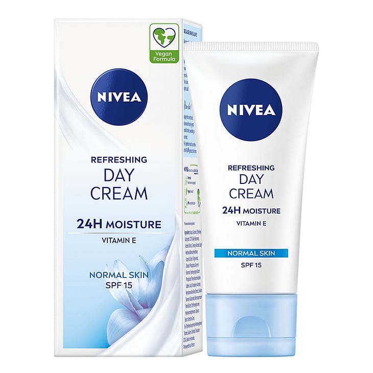 NIVEA Refreshing Day Cream SPF15. Erityisesti normaalille iholle suunniteltu vegaaninen päivävoide sisältää E-vitamiinia, luonnollista lumpeenkukkauutetta ja NIVEA® Moisture Care Complex -yhdisteen. Pitää ihon tehokkaasti kosteutettuna 24 tuntia ja ylläpitää ihon omaa kosteustasapainoa. Virkistävä, nopeasti imeytyvä voide jättää ihon sileän ja raikkaan tuntuiseksi ja kosteuttaa tehokkaasti. SK 15 suojaa ihoa UV-säteiden haitallisilta vaikutuksilta. Dermatologisesti testattu. 50 ml tuubipakkaus on helppo pitää mukana myös esim. matkoilla tai jumppakassissa.