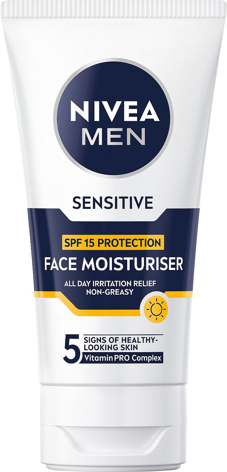 NIVEA MEN Sensitive Moisturiser SK15 -kasvovoide herkälle ja helposti ärtyvälle iholle. Kamomillaa ja E-vitamiinia sisältävä alkoholiton* ja hajusteeton koostumus rauhoittaa välittömästi 5 parranajon jälkeistä ihoärsytyksen merkkiä: polttavaa tunnetta, punoitusta, kuivuutta, kireyden tunnetta ja kutinaa. Taikapähkinää sisältävä kevyt voide kosteuttaa ihoa tehokkaasti 24 tunnin ajan. Suojakerroin 15 auttaa suojaamaan ihoa UVA/UVB-säteiltä ja auringon aiheuttamilta haittavaikutuksilta. Dermatologisesti testattu.