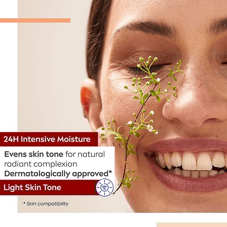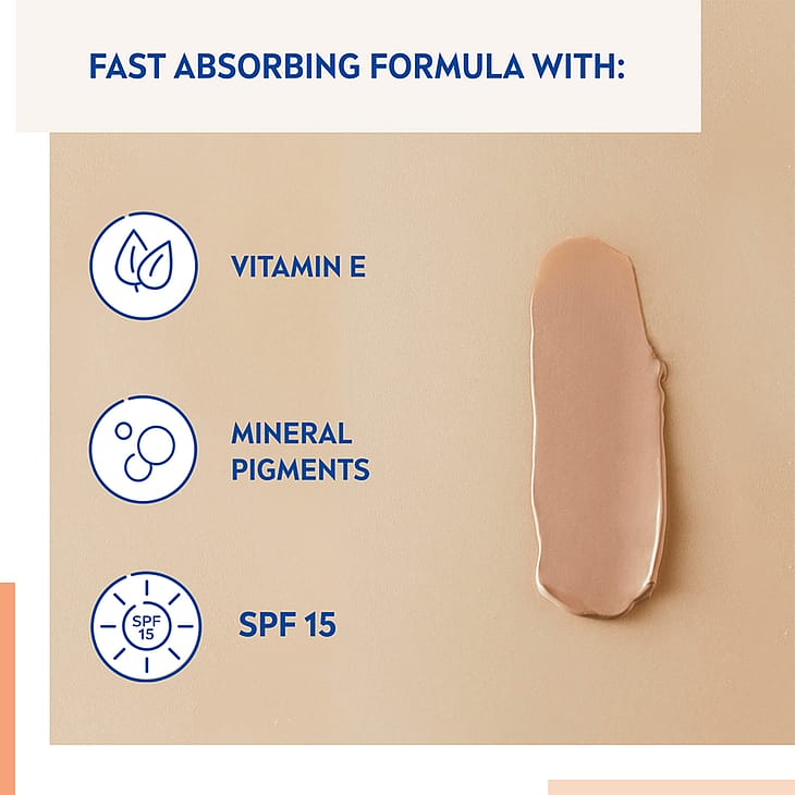 NIVEA Tinted Day Cream SK 15 - sävyttävä päivävoide tasoittaa ihonsävyä ja tekee ihosta luonnollisen säteilevän. E-vitamiinia ja mineraalipigmenttejä sisältävä koostumus kosteuttaa tehokkaasti 24 tunnin ajan ja tasapainottaa ihon omaa kosteustasoa. Vaaleille ihonsävyille tarkoitettu kasvovoide peittää ihon epätäydellisyyksiä, väsymyksen merkkejä, punoittavaa ihoa ja juonteita. Tekee ihosta raikkaan ja luonnollisen kauniin näköisen. Suojakerroin SK 15 ja UVA/UVB-suodattimet suojaavat kasvojen herkkää ihoa UV-säteiden haittavaikutuksilta. Dermatologisesti testattu.