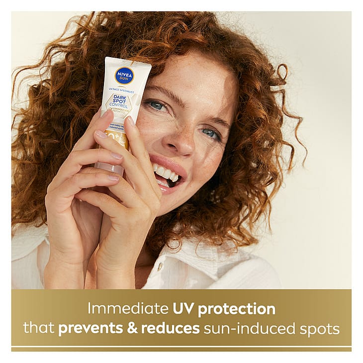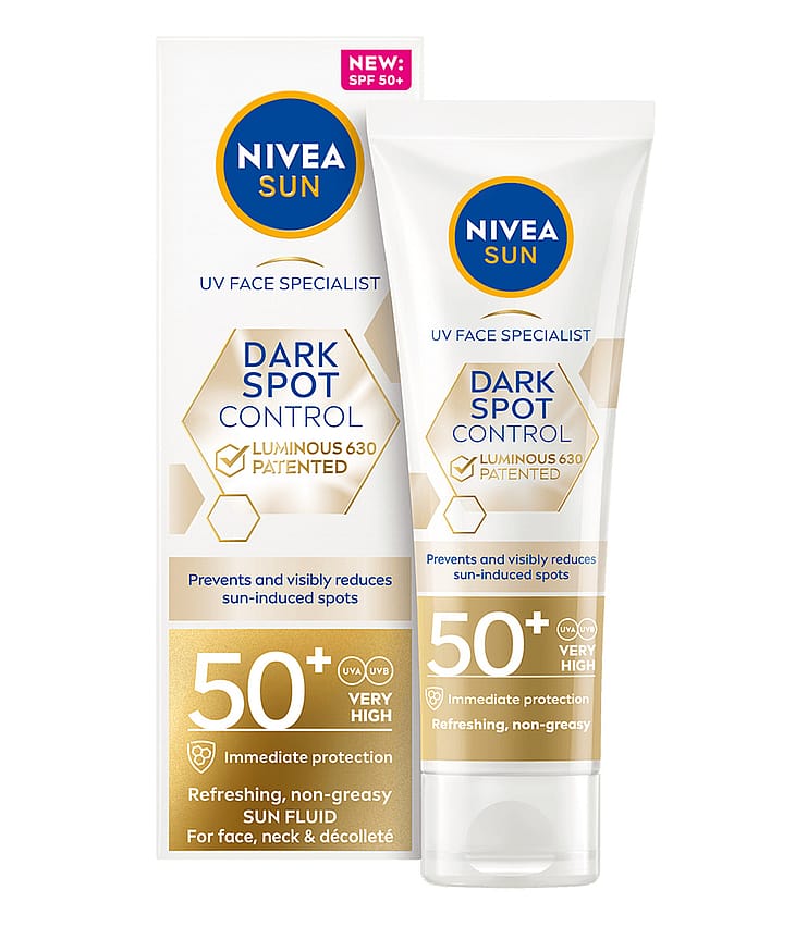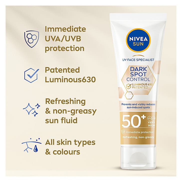 NIVEA SUN UV Face LUMINOUS630® Spot Control SK50+ -aurinkovoide kasvoille sisältää erittäin korkean suojakertoimen SK50+ ja välittömän suoja UVA-/UVB-säteilyä vastaan. Ehkäisee ja vähentää pigmenttiläiskiä.