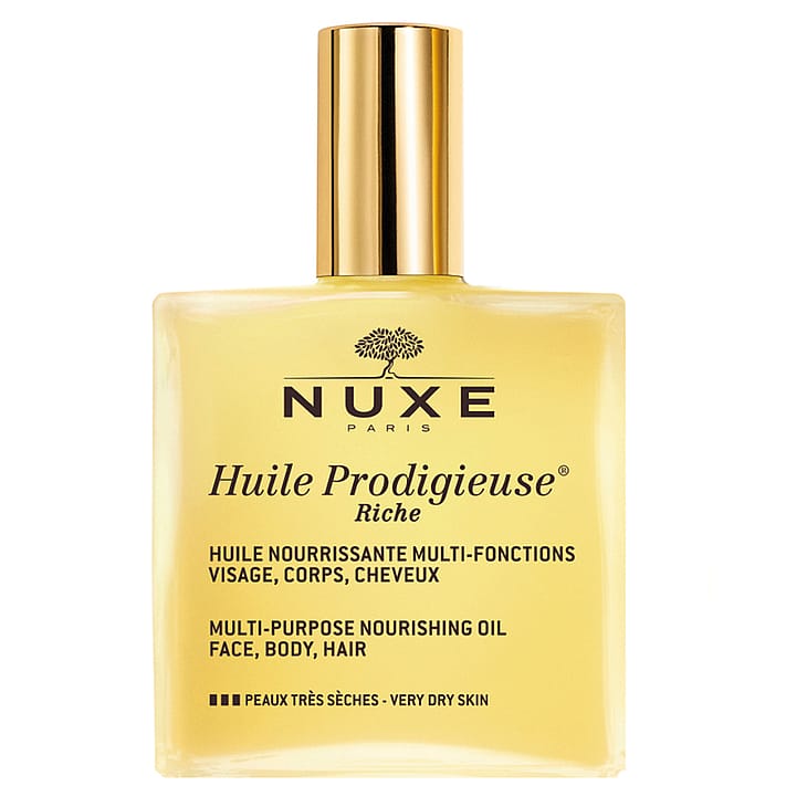 Ensimmäinen erittäin kuivalle iholle tarkoitettu öljy. Huile Prodigieuse Riche sisältää 30 % enemmän makadamiaöljyä kuin klassinen kuivaöljy. Helposti imeytyvä, tahmaamaton koostumus, jossa on sama upea tuoksu kuin alkuperäisessä tuotteessa. Sisältää korjaavaa arganöljyä. Ravitsevalla tsubaki- ja makadamiapähkinäöljyllä on anti age -vaikutus. Hasselpähkinäöljy rauhoittaa ja manteliöljy pehmittää. Kameliaöljyllä on kosteuttava ja kurkkuyrttiöljyllä silottava vaikutus. Sisältää myös kahta eri E-vitamiinityyppiä, jotka ovat ihon ennenaikaista ikääntymistä ehkäiseviä antioksidantteja.