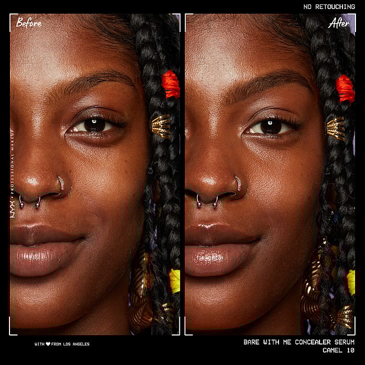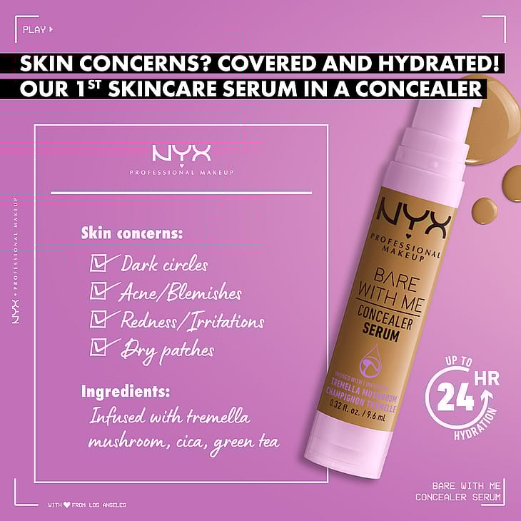 Stressaatko ihostasi? Ei tänään! Tutustu hoitavaan peitevoideseerumiimme kasvoille ja vartalolle. NYX Professional Makeup Bare With Me Concealer Serum -peitevoideseerumi. Vegaaninen koostumus*kosteuttaa ihoa jopa 24 tuntia ja iho tuntuu kosteutetulta koko päivän. Ihonhoito ja meikki yhdistyvät! Tummat silmänaluset, epäpuhtauksia ja ihon sävyn epätasaisuuksia? Hetkessä peitetty! Punoitusta ja ihon kuivumista? Ei enää! Koostumus sisältää Tremella-sientä, rohtosammakonputkea ja vihreää teetä. Saatavana useissa sävyissä. Piilota ihon ongelma-alueet samalla kun kosteutat ihoasi! Ei näytä kakkumaiselta ja tuntuu kevyeltä iholla. Lopeta ihostasi stressaaminen ja nauti tasaisesta ja kosteutetusta ihosta. Saat peittävyyttä ilman kakkumaista vaikutelmaa ja luonnolliselta näyttävän lähes huomaamattoman lopputuloksen. Saat ihoa hoitavia ominaisuuksia vain yhdellä pumppauksella. Helppo ja tasainen levitys, luonnolliselta näyttävä peittävyys ja jopa 24 tuntia kosteutta.