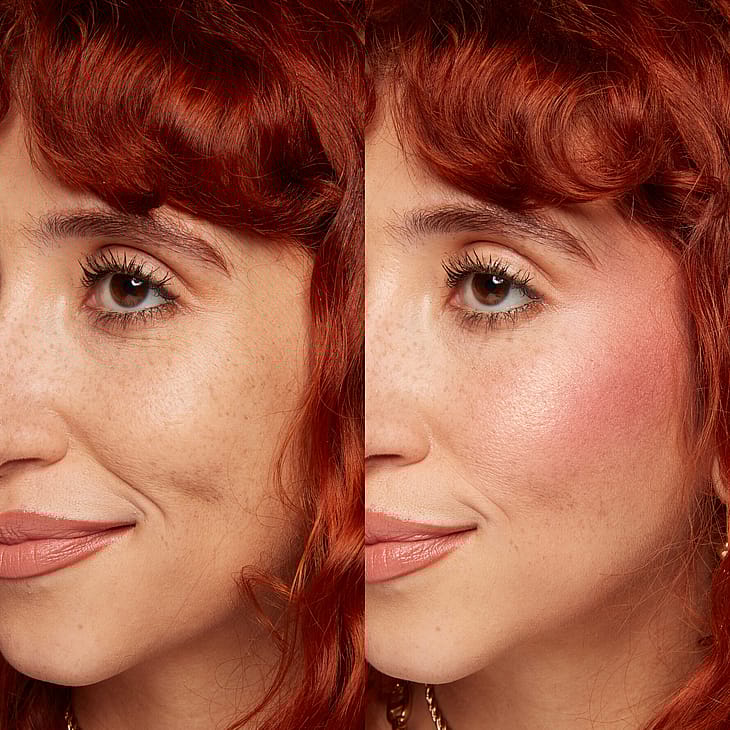 Poskipunavinkki: Tupsuttele punaa kevyesti otsalle. Levitä sitten siveltimellä poskien korkeimpiin kohtiin, ohimoille ja mahdollisesti nenän päähän antamaan lämpöä. Viimeistele Buttermelt Bronzer -aurinkopuuterilla saadaksesi upean päivettyneen lookin.
