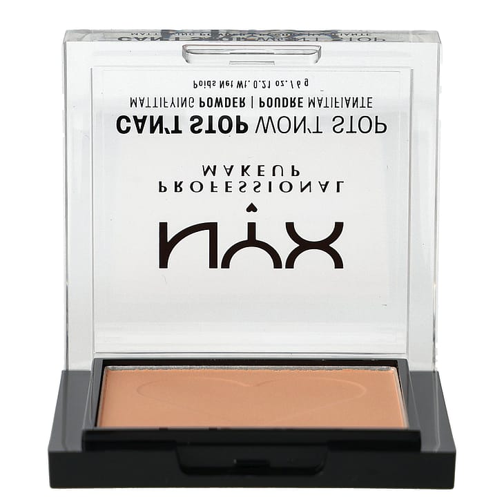 NYX Professional Makeup Can't Stop Won't Stop Mattifying Powder -puuteri antaa iholle välittömästi mattapintaisen lopputuloksen ja hillitsee ihon kiiltoa ja rasvaisuutta. Kevyt, vegaaninen koostumus* antaa iholle tasaisen, matan lopputuloksen näyttämättä kuivalta, kakkumaiselta tai tunkkaiselta. Läpikuultavat, kerrostettavat sävyt sulautuvat helposti iholle asettumatta pieniin juonteisiin ja antavat tasaisen, sileän lopputuloksen. Mattapuuteri pidentää meikkivoiteen kestoa ja mattapintaa tahraamatta, leviämättä ja muuttumatta! Puuteri hillitsee ihon kiiltoa koko päivän ja antaa erittäin mattapintaisen lopputuloksen, joka ei vaadi korjailua päivän mittaan.