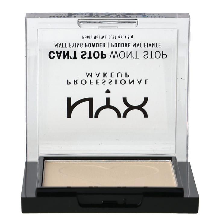NYX Professional Makeup Can't Stop Won't Stop Mattifying Powder -puuteri antaa iholle välittömästi mattapintaisen lopputuloksen ja hillitsee ihon kiiltoa ja rasvaisuutta. Kevyt, vegaaninen koostumus* antaa iholle tasaisen, matan lopputuloksen näyttämättä kuivalta, kakkumaiselta tai tunkkaiselta. Läpikuultavat, kerrostettavat sävyt sulautuvat helposti iholle asettumatta pieniin juonteisiin ja antavat tasaisen, sileän lopputuloksen. Mattapuuteri pidentää meikkivoiteen kestoa ja mattapintaa tahraamatta, leviämättä ja muuttumatta! Puuteri hillitsee ihon kiiltoa koko päivän ja antaa erittäin mattapintaisen lopputuloksen, joka ei vaadi korjailua päivän mittaan.