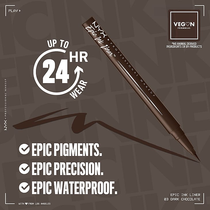 NYX Professional Makeup nestemäinen, vedenkestävä silmänrajauskynä sivellinkärjellä tekee erittäin tarkkojen rajausten tekemisestä todella helppoa. Vain yhdellä vedolla teet vaivattomasti runsaspigmenttisen ja pitkäkestoisen rajauksen. Ohuella, joustavalla sivellinkärjellä piirrät helposti sekä hillittyjä että voimakkaampia rajauksia. Halusitpa hillityn rajauksen tai klassiset kissansilmät, vedenkestävällä, nestemäisellä silmänrajauskynällä upeiden meikkien tekeminen onnistuu. Saatavana useissa runsaspigmenttisissä sävyissä.