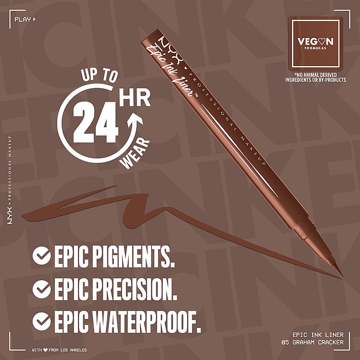 NYX Professional Makeup nestemäinen, vedenkestävä silmänrajauskynä sivellinkärjellä tekee erittäin tarkkojen rajausten tekemisestä todella helppoa. Vain yhdellä vedolla teet vaivattomasti runsaspigmenttisen ja pitkäkestoisen rajauksen. Ohuella, joustavalla sivellinkärjellä piirrät helposti sekä hillittyjä että voimakkaampia rajauksia. Halusitpa hillityn rajauksen tai klassiset kissansilmät, vedenkestävällä, nestemäisellä silmänrajauskynällä upeiden meikkien tekeminen onnistuu. Saatavana useissa runsaspigmenttisissä sävyissä.