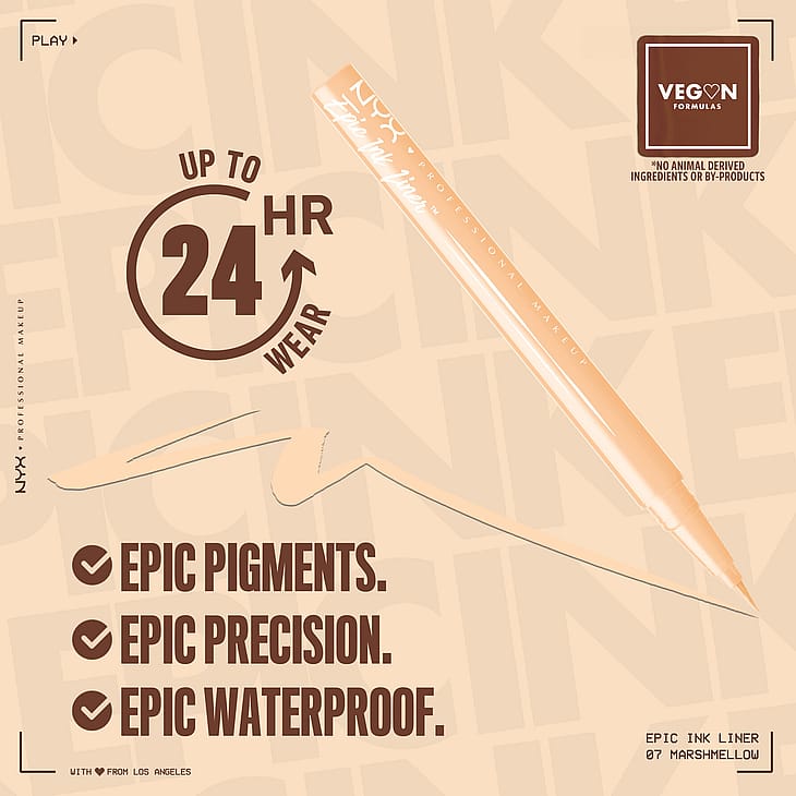 NYX Professional Makeup nestemäinen, vedenkestävä silmänrajauskynä sivellinkärjellä tekee erittäin tarkkojen rajausten tekemisestä todella helppoa. Vain yhdellä vedolla teet vaivattomasti runsaspigmenttisen ja pitkäkestoisen rajauksen. Ohuella, joustavalla sivellinkärjellä piirrät helposti sekä hillittyjä että voimakkaampia rajauksia. Halusitpa hillityn rajauksen tai klassiset kissansilmät, vedenkestävällä, nestemäisellä silmänrajauskynällä upeiden meikkien tekeminen onnistuu. Saatavana useissa runsaspigmenttisissä sävyissä.