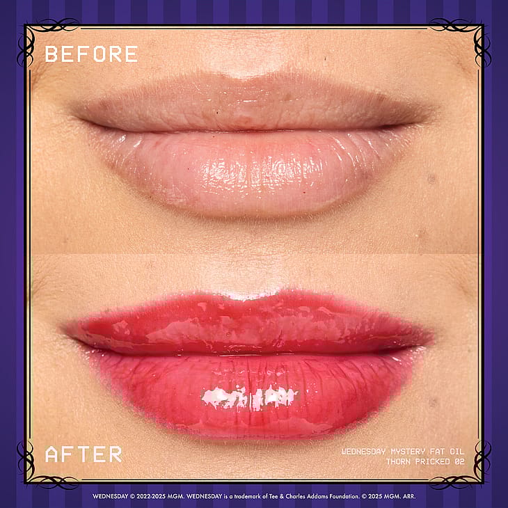 The Wednesday Mystery Lip Oil -huuliöljy kaikkea muuta kuin tavanomainen. Koostumus muuntaa huulesi kauniisti antamalla niille pitkäkestoista kosteutusta ja kiiltoa ilman tahmaista tunnetta. Tulet ihastumaan kookkaaseen FAT-applikaattoriimme. Erittäin kookkaalla applikaattorilla kolme upouutta väriä vaihtavaa sävyä levittyvät helposti ja tasaisesti. Jokainen sävy on yhtä salaperäinen kuin Wednesday itse.