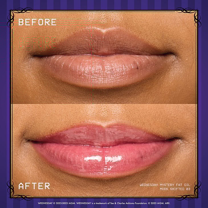The Wednesday Mystery Lip Oil -huuliöljy kaikkea muuta kuin tavanomainen. Koostumus muuntaa huulesi kauniisti antamalla niille pitkäkestoista kosteutusta ja kiiltoa ilman tahmaista tunnetta. Tulet ihastumaan kookkaaseen FAT-applikaattoriimme. Erittäin kookkaalla applikaattorilla kolme upouutta väriä vaihtavaa sävyä levittyvät helposti ja tasaisesti. Jokainen sävy on yhtä salaperäinen kuin Wednesday itse.