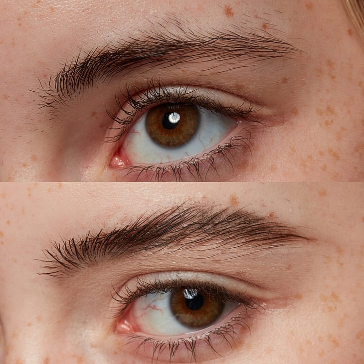 Muotoile kulmat The Brow Glue -kulmageelillä ja kulmaharjalla. Vinkki: Laminoidun lookin luomiseksi harjaa kulmat ylöspäin ja täytä sitten aukkokohdat kulmatuotteella.