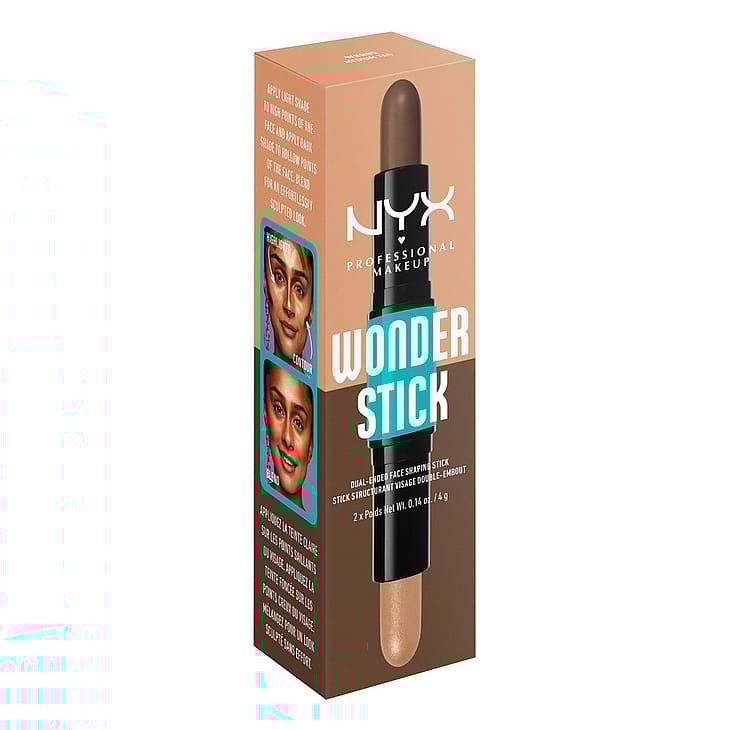 Korosta kasvonpiirteitäsi NYX Professional Makeup Wonder Stick kaksipäisellä korostuspuikolla. Tarkkaan contouring-meikkiin tai hehkuvaan korostukseen. Muotoile, valaise ja häivytä. Kaikki sävyt ovat vegaanisia* ja ihanan voidemainen koostumus on helppo häivyttää. Aloita levittämällä tummempaa sävyä antamaan muotoa kasvoillesi ja levitä sitten vaaleampaa sävyä valaisemaan kasvojesi korkeimpia kohtia. Häivytä huolellisesti.