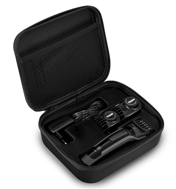 Mukana kolme ohjauskampaa: mikrotarkkuuskampa parralle (0,5–15 mm) sekä kaksi kampaa hiuksille (3–30 mm). Kotiparturin, laturin ja lisävarusteiden säilytystä varten mukana toimitetaan iskunkestävä matkakotelo.