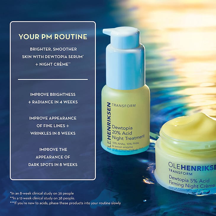 Koe Dewtopia ja herää kauneusunilta, joiden aikana ihosi on muuttunut kiinteämmäksi, pehmeämmäksi ja täyteläisemmäksi. Ole Henriksen tuo markkinoille menestysseerumi Dewtopia™ 20% Acid Night Treatment -tuotteen lisäksi uuden ihonhoitotuotteen, joka on valmis muuttaman ihosi samanlaiseksi kuin Tuhkimolla yöllä – Dewtopia 5% Acid Firming Night Creme on tehokas anti age -yövoide, joka sisältää ihoa tasoittavaa AHAa, kiinteyttävää punalevää, ryppyjä ehkäisevää bakuchiolia ja ultrapehmentävää sheavoita.