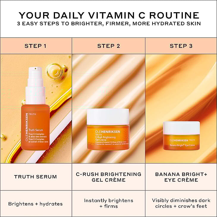 C-Rush Brightening Gel Crème: Levitä tasaisesti kasvoille ja kaulalle aamuin illoin Truth Serumin jälkeen. Hiero voidetta varovasti ylöspäin suuntautuvin, pyörivin liikkein.