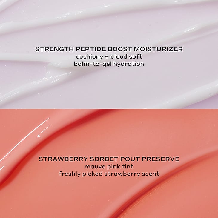 Täytä ja kosteuta ihoasi ja huuliasi tällä minikokoisella duolla. Peptidien voimin nämä bestsellerit antavat kiinteämmän, kimmoisamman ihon ja täyteläisemmän ilmeen vain 1 viikossa**. Strength Moisturizer on keramidilla vahvistettu päivittäinen välttämättömyys, joka kiinteyttää, parantaa näkyvästi hienojen viivojen ja ryppyjen ulkonäköä ja vahvistaa ihon suojaa koko päivän ajan. Strawberry Sorbet Pout Preserve Peptide Lip Treatment ravitsee huulia kokumvoilla, joka täyttää ja kosteuttaa huulia mauve-sävyllä ja tuoreiden mansikoiden tuoksulla.