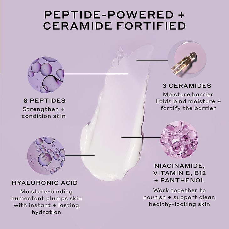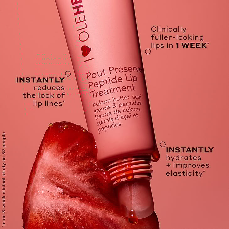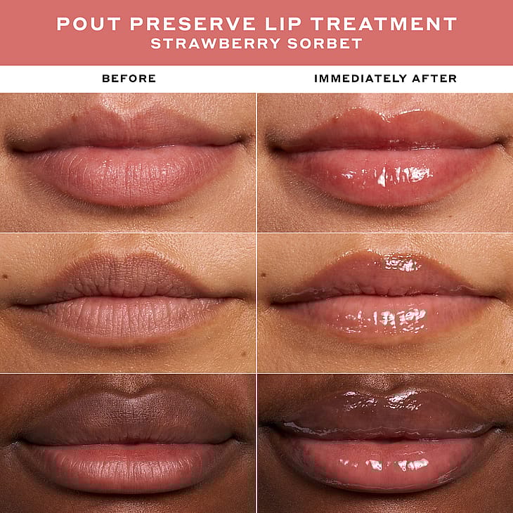 AQUA/WATER/EAU, PROPANEDIOL, DICAPRYLYL CARBONATE, GLYCERIN, METHYLPROPANEDIOL, CETEARYL ALCOHOL, STEARYL ALCOHOL, MANGIFERA INDICA (MANGO) SEED BUTTER, NIACINAMIDE, ACETYL HEXAPEPTIDE-1, ACETYL HEXAPEPTIDE-8, ACETYL OCTAPEPTIDE-3, ACETYL TETRAPEPTIDE-2, ACETYL DIPEPTIDE-1 CETYL ESTER, PALMITOYL TRIPEPTIDE-1, PALMITOYL TETRAPEPTIDE-7, CARNOSINE, CERAMIDE NP, CERAMIDE AP, CERAMIDE EOP, SERINE, ALANINE, GLYCINE, GLUTAMIC ACID, LYSINE HCL, THREONINE, ARGININE, PROLINE, HYALURONIC ACID, SODIUM HYALURONATE, LINOLEIC ACID, LINOLENIC ACID, SODIUM PCA, SODIUM LACTATE, PANTHENOL, TOCOPHEROL, TOCOPHERYL ACETATE, BETAINE, PCA, CYANOCOBALAMIN, XYLITOL, ANHYDROXYLITOL, XYLITYLGLUCOSIDE, SORBITAN OLIVATE, CARBOMER, HYDROXYETHYLCELLULOSE, XANTHAN GUM, CETEARYL OLIVATE, SORBITAN LAURATE, PHYTOSPHINGOSINE, CHOLESTEROL, POLYSORBATE 60, BUTYLENE GLYCOL, HYDROXYACETOPHENONE, HYDROLYZED VEGETABLE PROTEIN, ACRYLATES/C10-30 ALKYL ACRYLATE CROSSPOLYMER, POLYSORBATE 20, AMMONIUM ACRYLOYLDIMETHYLTAURATE/BEHENETH-25 METHACRYLATE CROSSPOLYMER, DIMETHICONE, SODIUM PHYTATE, SODIUM LAUROYL LACTYLATE, PENTAERYTHRITYL TETRA-DI-T-BUTYL HYDROXYHYDROCINNAMATE, LEUCONOSTOC/RADISH ROOT FERMENT FILTRATE, CITRIC ACID, CAPRYLYL GLYCOL, ETHYLHEXYLGLYCERIN, PHENOXYETHANOL, PARFUM/FRAGRANCE*, CITRAL, LIMONENE, LINALOOL. B *NATURALLY DERIVED FRAGRANCE PER ISO STANDARD 16128-1. Pout Preserve peptide Lip Treatment Strawberry Sorbet: SUCROSE, COCOS NUCIFERA (COCONUT) OIL, HELIANTHUS ANNUUS (SUNFLOWER) SEED OIL, BUTYROSPERMUM PARKII (SHEA) BUTTER, CANDELILLA CERA/EUPHORBIA CERIFERA (CANDELILLA) WAX/CIRE DE CANDELILLA, RICINUS COMMUNIS (CASTOR) SEED OIL, BEHENYL BEHENATE, HYDROGENATED COCO-GLYCERIDES, THEOBROMA CACAO (COCOA) SEED BUTTER, POLYHYDROXYSTEARIC ACID, GARCINIA INDICA SEED BUTTER, CERA CARNAUBA/COPERNICIA CERIFERA (CARNAUBA) WAX/CIRE DE CARNAUBA, PARFUM/FRAGRANCE, TOCOPHEROL, SODIUM SACCHARIN, CITRAL, CITRUS AURANTIUM PEEL OIL, CITRUS AURANTIUM BERGAMIA PEEL OIL, LIMONENE, LINALOOL, LINALYL ACETATE, PINENE, TERPINEOL. A
