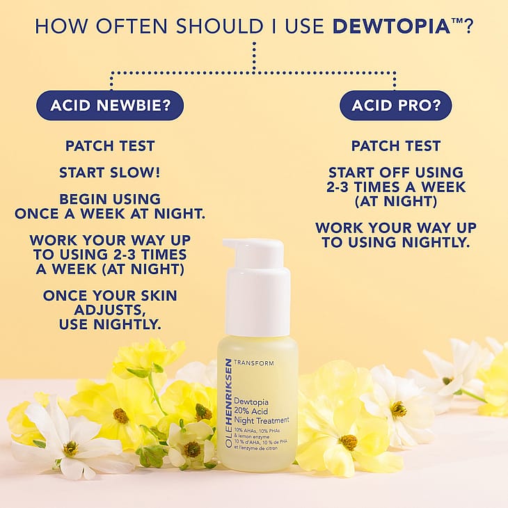 Koe Dewtopia: herää aivan uudenlaisilta kauneusunilta, kun ihosi on täydellisen kosteutettu ja tasainen. Ole Henriksen tuo markkinoille Dewtopia™ 20 % Acid Night Treatment -hoidon, joka on tehokkain tasoittava seerumimme. Se sisältää happoja, jotka vaikuttavat nukkuessasi.