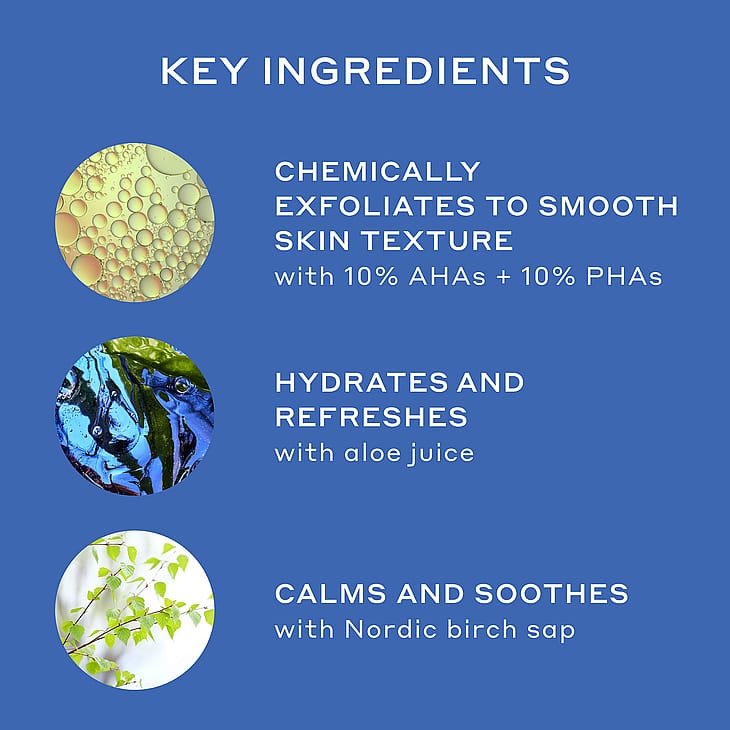 Aqua/Water/Eau, Aloe Barbadensis Leaf Juice, Betula Alba Juice, Gluconolactone, Glycolic Acid, Gossypium Herbaceum (Cotton) Fruit Water, Lactic Acid, Isoamyl Laurate, Potassium Hydroxide, Polyacrylate Crosspolymer-6, Silica, Sodium Hydroxide, Neopentyl Glycol Diheptanoate, Polyglyceryl-3 Laurate, Gluconic Acid, Citrus Limon (Lemon) Fruit Extract, Dipotassium Glycyrrhizate, Glycyrrhiza Glabra (Licorice) Root Extract, Saccharum Officinarum (Sugarcane) Extract/Extrait De Canne A Sucre, Chamomilla Recutita (Matricaria) Flower Extract, Citrus Aurantifolia (Lime) Peel Extract, Citrus Limon (Lemon) Peel Oil, Santalum Album (Sandalwood) Extract, Glycerin, Leuconostoc/Radish Root Ferment Filtrate, Sodium Riboflavin Phosphate, Citrus Aurantium Bergamia (Bergamot) Peel Oil, Triethyl Citrate, Isododecane, Polysorbate 60, Sorbitan Isostearate, Hydroxyethyl Acrylate/Sodium Acryloyldimethyl Taurate Copolymer, Pentaerythrityl Tetra-Di-T-Butyl Hydroxyhydrocinnamate, Dimethylhydroxy Furanone, Vanillin, 1, 2-Hexanediol, Caprylyl Glycol, Phenoxyethanol, Limonene, Linalool, Citral.
