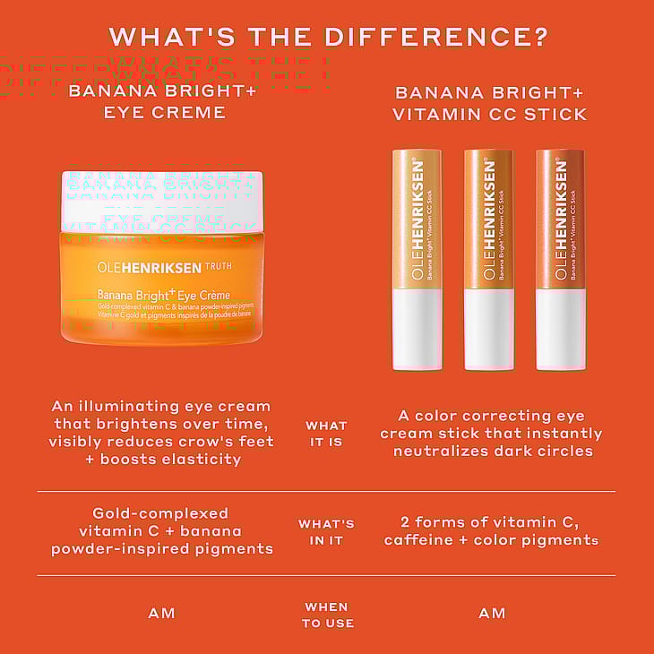Ole Henriksen esittelee Banana Bright+ Vitamin CC Sticks - kolme väriä korjaavaa CC-sticksiä silmävoiteen eduilla ja peitevärin ominaisuuksilla, jotka kirkastavat ja korjaavat tummien silmänalusten väriä vain yhdellä levityksellä!