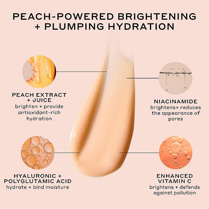AQUA/WATER/EAU, GLYCERIN, ETHYLHEXYL PALMITATE, DICAPRYLYL CARBONATE, PRUNUS PERSICA (PEACH) JUICE, BIS-BEHENYL/ISOSTEARYL/PHYTOSTERYL DIMER DILINOLEYL DIMER DILINOLEATE, 3-O-ETHYL ASCORBIC ACID, NIACINAMIDE, RUBUS CHAMAEMORUS FRUIT JUICE, PRUNUS PERSICA (PEACH) FRUIT EXTRACT, SODIUM HYALURONATE, SODIUM POLYGLUTAMATE, TERMINALIA FERDINANDIANA FRUIT EXTRACT, TREMELLA FUCIFORMIS SPOROCARP EXTRACT, TOCOPHEROL, BETAINE, LACTOBACILLUS FERMENT, XYLITYLGLUCOSIDE, XYLITOL, ANHYDROXYLITOL ETHYLHEXYLGLYCERIN, POLYGLYCERYL-3 STEARATE, MICA, POLYACRYLATE CROSSPOLYMER-6, ACRYLATES/C10-30 ALKYL ACRYLATE CROSSPOLYMER, HYDROXYETHYL ACRYLATE/SODIUM ACRYLOYLDIMETHYL TAURATE COPOLYMER, PENTAERYTHRITYL TETRA-DI-T-BUTYL HYDROXYDROCINNAMATE, ISOHEXADECANE, POLYSORBATE 60, POTASSIUM SORBATE, SODIUM HYDROXIDE, SORBITAN ISOSTEARATE, LEUCONOSTOC/RADISH ROOT FERMENT FILTRATE, KAEMPFERIA GALANGA ROOT EXTRACT, PONGAMIA PINNATA SEED EXTRACT, POLYCITRONELLOL, GLYCINE SOJA (SOYBEAN) OIL, TRIETHYL CITRATE, ISOAMYL LAURATE, PHENOXYETHANOL, PARFUM (FRAGRANCE), YELLOW 5 (CI 19140), TITANIUM DIOXIDE (CI 77891), RED 40 (CI 16035). A