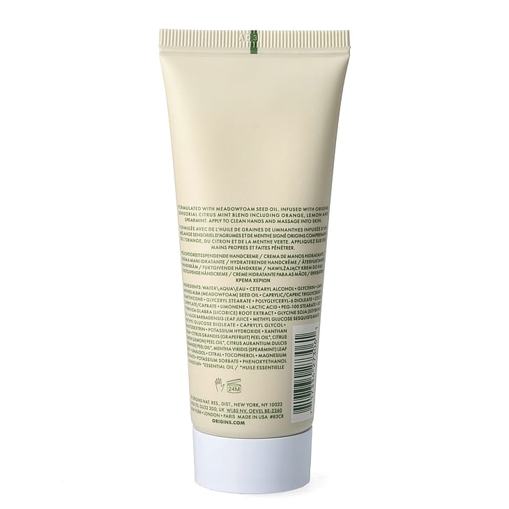 Valmistettu Originsin appelsiinin, sitruunan ja piparmintun aistillisen eteerisen öljysekoituksen avulla, tämä kosteuttava käsivoide käyttää luonnon omia pehmeitä ainesosia, kuten meadowfoam-siemenöljyä ja kasviperäistä glyseriiniä, jotta kädet tuntuvat pehmeiltä, sileiltä ja hetkessä kosteutetuilta.