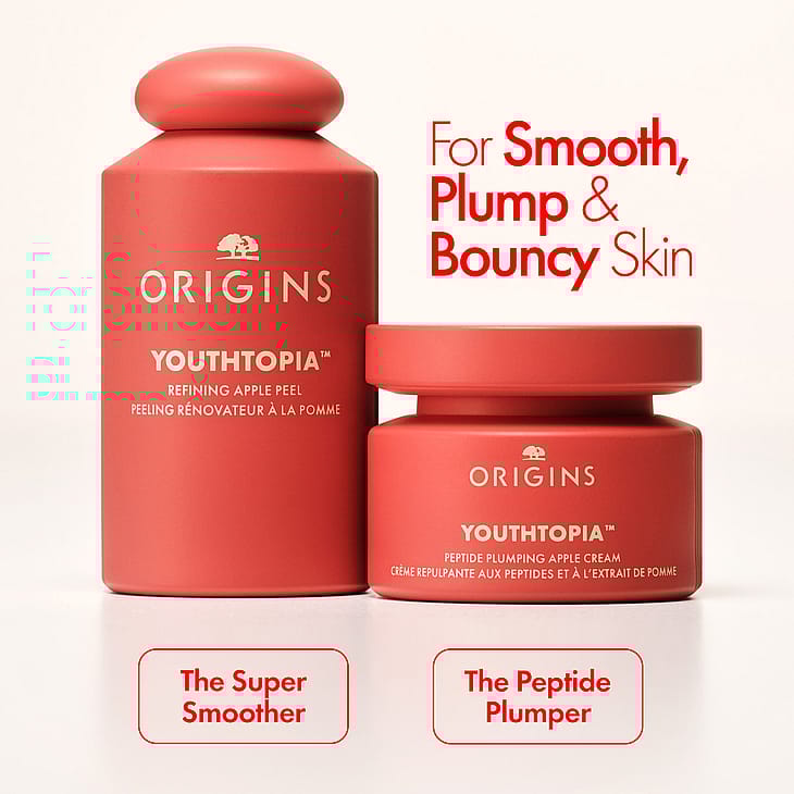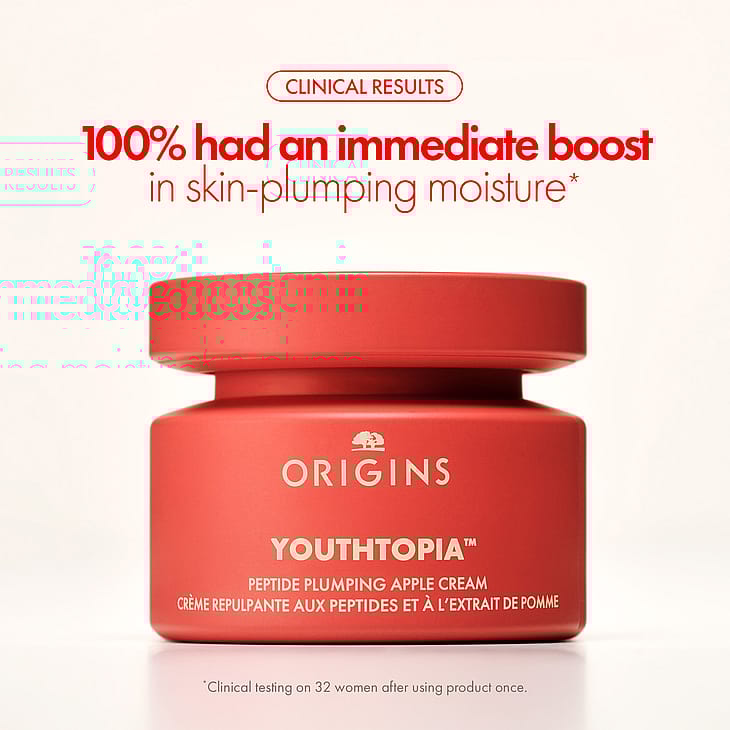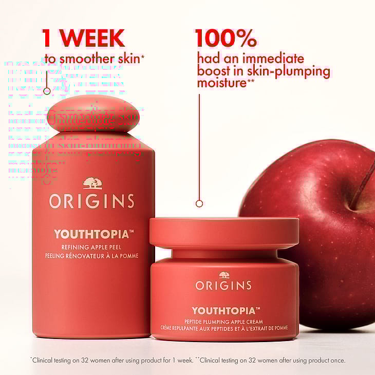 Originsin uusi Youthtopia™ Peptide Plumping Apple Cream Moisturizer -kasvovoide – yli 50 000 omenan kantasolulla – lisää kosteutta, parantaa ihon kimmoisuutta ja tekee siitä näkyvästi sileämmän.