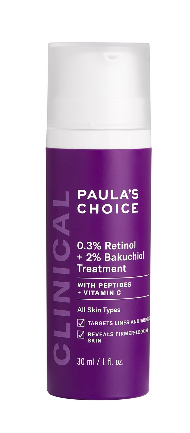 Clinical 0,3 % retinoli + 2 % bakuchiol -hoitovoiteen edistyksellinen koostumus on kehitetty erityisesti häivyttämään hienoja juonteita ja ryppyjä, palauttamaan ihon kiinteyttä ja tasoittamaan ihonsävyä. Tehokas koostumus sisältää ikääntymisen merkkejä vastaan kolmivaikutteisen yhdistelmän, joka koostuu retinolista ja kasviperäisen bakuchiolin suuresta pitoisuudesta. Lisäksi se sisältää tehokkaan peptidiyhdistelmän, joka stimuloi kollageenin tuotantoa.