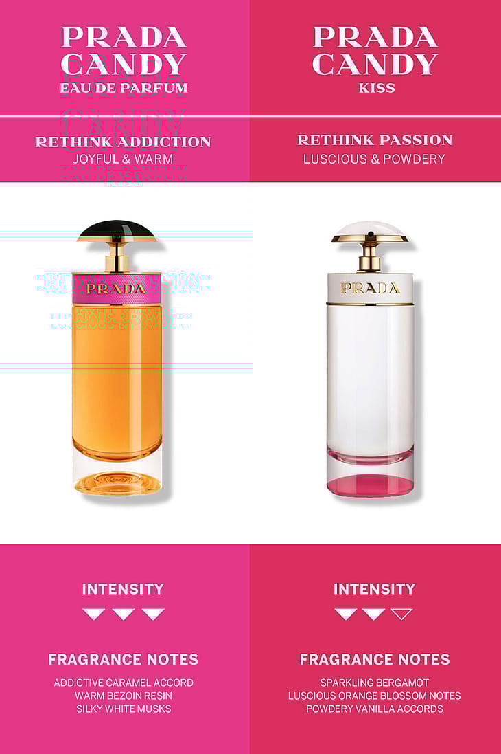 Prada Candy Eau de Parfum on leikkisä ja elegantti, itämainen gourmand-tuoksu, jossa yhdistyvät hillitty valkoinen myski, lämmin bentsoehartsi ja koukuttava makea toffee. Tuoksu korostaa naisen persoonaa monella eri tavalla: hän on avokätinen, sielultaan vapaa ja aina rehellinen itseään ja muita kohtaan. Tuoksu on luotu naiselle, joka vangitsee huomion. Prada Candyn pullo on rohkea, tavallisuudesta poikkeava ja erottuva, mutta samalla ylellinen. Pullon pinkkiä saffianonahkaista rengasta koristaa Prada-logo eleganttia kultaa. Kullanvärisen pumpun yläosassa on kiiltävän musta puolikuun muotoinen osa kirsikkana kakun päällä.