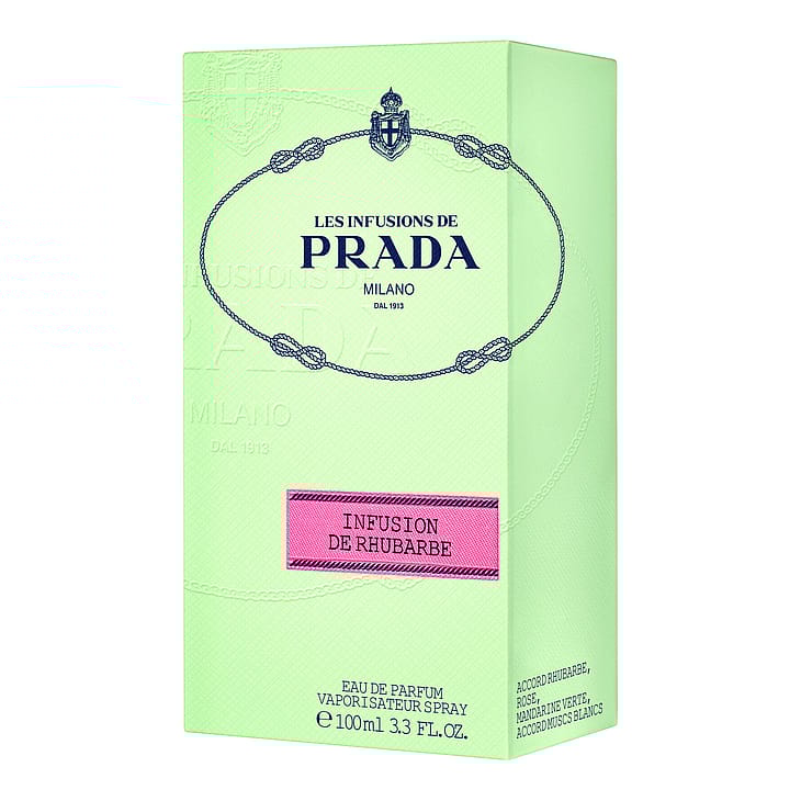 Ylellistä Infusion de Rhubarben -pulloa on korostettu hienovaraisella värin välähdyksellä, joka kuvaa raparperin infuusiota, ja ikoninen Saffiano-korkki muistuttaa raparperin väristä. Pradan Savoy-logo suunniteltiin vuonna 1919, kun yhtiö nimitettiin Italian monarkkien viralliseksi tavarantoimittajaksi. Prada sai lisätä House of Savoyn heraldiset elementit logoonsa. Se löytyy jokaisesta Les Infusions -pullosta.