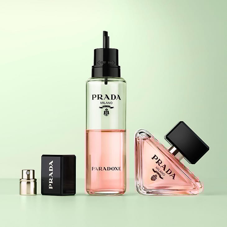 kietoo sisäänsä Pradam syvimmän olemuksen, Prada Paradoxe Eau de Parfum -tuoksun. Uudelleentäytettävä pullo uudistaa brändin ikonisimman koodin. Kallistunut, samalla voimakkaan maanläheinen ja vakaa pullo muodostaa esteettisen suoran kulman siirtyen optimistisesti alhaalta ylöspäin pohjasta korkkiin. Pullon radikaalia kolmiomaista nimikkomuotoa pehmentävät pyöristetyt kulmat, ja hienovarainen korallinpunainen tuoksu luo vastapainoa syvän mustalle Prada-vaakunalle. Naisellinen mutta silti huomiota herättävä - ja välittömästi tunnistettava – pullon päällä on kullanvärinen pumppu, josta heijastuu
