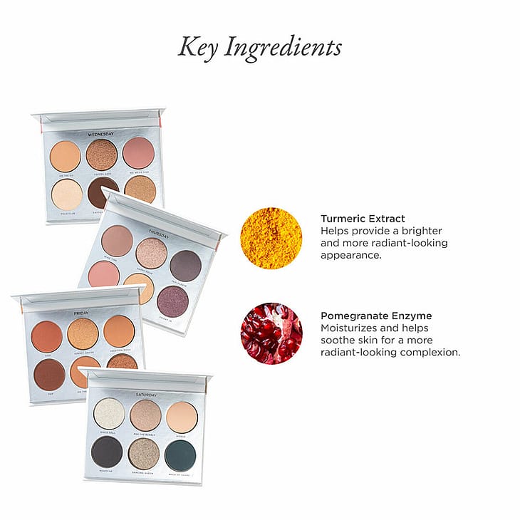 THURSDAY PALETTE: WINE TIME: MICA, ZINC STEARATE, ORYZA SATIVA (RICE) EXTRACT, SILICA, BORON NITRIDE, LAUROYL LYSINE, SODIUM DEHYDROACETATE, PHENOXYETHANOL, SORBIC ACID, ALUMINUM DIMYRISTATE, TRIETHOXYCAPRYLYLSILANE, DISODIUM STEAROYL GLUTAMATE, CAPRYLIC/CAPRIC TRIGLYCERIDE, LACTOBACILLUS/PUNICA GRANATUM FRUIT FERMENT EXTRACT, GLYCERIN, CURCUMA LONGA (TURMERIC) ROOT EXTRACT, LEUCONOSTOC/RADISH ROOT FERMENT FILTRATE, MANGANESE VIOLET (CI 77742), IRON OXIDES (CI 77491, CI 77492, CI 77499), TITANIUM DIOXIDE (CI 77891), ULTRAMARINES (CI 77007). HAPPY HOUR: MICA, CALCIUM ALUMINUM BOROSILICATE, CAPRYLIC/CAPRIC TRIGLYCERIDE, ORYZA SATIVA (RICE) EXTRACT, ZINC STEARATE, SILICA, SODIUM DEHYDROACETATE, PHENOXYETHANOL, SORBIC ACID, TIN OXIDE, BORON NITRIDE, LAUROYL LYSINE, LACTOBACILLUS/PUNICA GRANATUM FRUIT FERMENT EXTRACT, GLYCERIN, CURCUMA LONGA (TURMERIC) ROOT EXTRACT, LEUCONOSTOC/RADISH ROOT FERMENT FILTRATE, ALUMINUM DIMYRISTATE, TRIETHOXYCAPRYLYLSILANE, DISODIUM STEAROYL GLUTAMATE, TITANIUM DIOXIDE (CI 77891), IRON OXIDES (CI 77491, CI 77499), FERRIC FERROCYANIDE (CI 77510). TAXI PLEASE: MICA, ORYZA SATIVA (RICE) EXTRACT, ZINC STEARATE, BORON NITRIDE, LAUROYL LYSINE, SILICA, SODIUM DEHYDROACETATE, PHENOXYETHANOL, SORBIC ACID, ALUMINUM DIMYRISTATE, TRIETHOXYCAPRYLYLSILANE, DISODIUM STEAROYL GLUTAMATE, CAPRYLIC/CAPRIC TRIGLYCERIDE, LACTOBACILLUS/PUNICA GRANATUM FRUIT FERMENT EXTRACT, GLYCERIN, CURCUMA LONGA (TURMERIC) ROOT EXTRACT, LEUCONOSTOC/RADISH ROOT FERMENT FILTRATE, MANGANESE VIOLET (CI 77742), IRON OXIDES (CI 77491, CI 77499). DAY DATE, PAMPERED: MICA, ORYZA SATIVA (RICE) EXTRACT, ZINC STEARATE, SILICA, BORON NITRIDE, LAUROYL LYSINE, SODIUM DEHYDROACETATE, PHENOXYETHANOL, SORBIC ACID, ALUMINUM DIMYRISTATE, TRIETHOXYCAPRYLYLSILANE, DISODIUM STEAROYL GLUTAMATE, CAPRYLIC/CAPRIC TRIGLYCERIDE, LACTOBACILLUS/PUNICA GRANATUM FRUIT FERMENT EXTRACT, GLYCERIN, CURCUMA LONGA (TURMERIC) ROOT EXTRACT, LEUCONOSTOC/RADISH ROOT FERMENT FILTRATE. MAY CONTAIN [+/-]: MANGANESE VIOLET (CI 77742), TITANIUM DIOXIDE (CI 77891), IRON OXIDES (CI 77491, CI 77492, CI 77499). FRIDAY JR.: MICA, CAPRYLIC/CAPRIC TRIGLYCERIDE, ORYZA SATIVA (RICE) EXTRACT, ZINC STEARATE, SILICA, SODIUM DEHYDROACETATE, PHENOXYETHANOL, SORBIC ACID, TIN OXIDE, BORON NITRIDE, LAUROYL LYSINE, LACTOBACILLUS/PUNICA GRANATUM FRUIT FERMENT EXTRACT, GLYCERIN, CURCUMA LONGA (TURMERIC) ROOT EXTRACT, ALUMINUM DIMYRISTATE, TRIETHOXYCAPRYLYLSILANE, DISODIUM STEAROYL GLUTAMATE, LEUCONOSTOC/RADISH ROOT FERMENT FILTRATE, TITANIUM DIOXIDE (CI 77891), IRON OXIDES (CI 77491, CI 77499), FERRIC FERROCYANIDE (CI 77510).