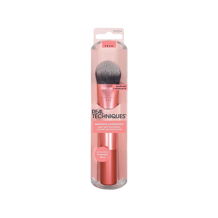 Real Techniques Seamless Complexion Makeup Brush -meikkisiveltimessä on pehmeät, joustavat harjakset, joiden avulla meikin sekä ihonhoitotuotteiden levitys on vaivatonta ja lopputulos on hehkuvan upea. Käytä Real Techniques Seamless Complexion -sivellintä meikkivoiteen, pohjustusaineen ja kosteusvoiteen levittämiseen virheettömän lopputuloksen saamiseksi.
