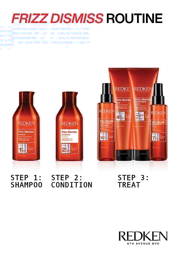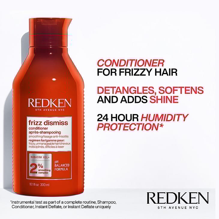 Redken Frizz Dismiss Conditioner on anti-frizz hoitoaine. Se kesyttää pörröisiä hiuksia, parantaa niiden käsiteltävyyttä ja korostaa hiusten kiiltoa. Tämä hoitoaine sisältää Redkenin Smoothin Complex -ainesosayhdistelmän ja solidaarisesti tuotettua babassuöljyä. Se selvittää hiuksia ja suojaa niitä pörröisyyttä vastaan samalla, kun se tekee hiuksista pehmeämmät ja kiiltävämmät.