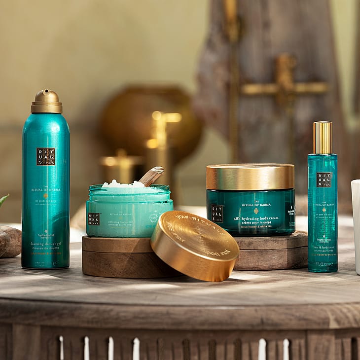 Kuorinta-aine myös elvyttää ihoa ja antaa sille lootuksen kukan ja valkoisen teen ihanan tuoksun. Käytä lopuksi vielä The Ritual of Karma Body Cream -vartalovoidetta: kuorinta-aine varmistaa, että tämä kosteuttava voide pääsee imeytymään entistä syvemmälle ihoon ja kosteuttamaan erityisen tehokkaasti. Tai hemmottele itseäsi yön yli iholle jätettävällä vartalonaamiolla kerran tai kahdesti viikossa saadaksesi ihollesi erityisen tehokkaan annoksen kosteutusta.
