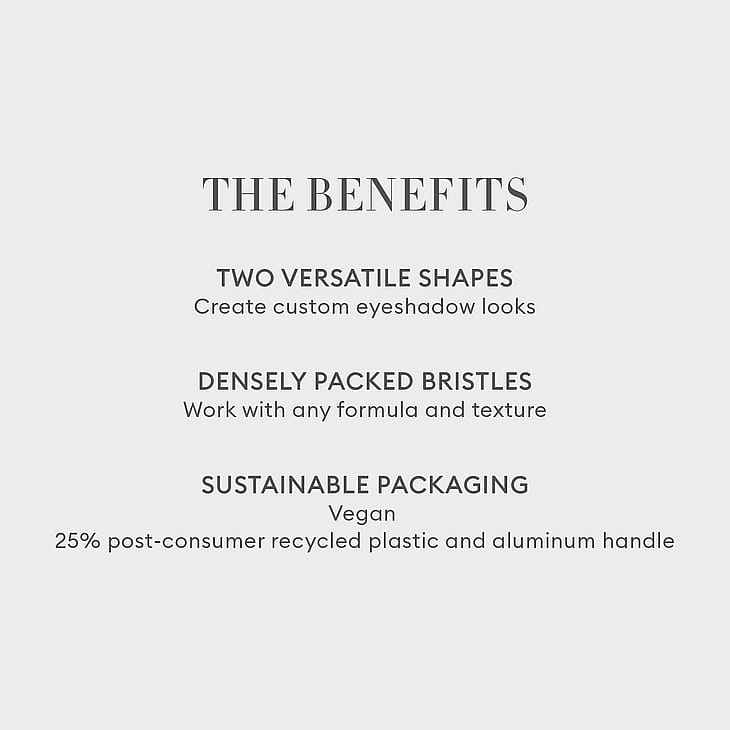 Kaksipäinen luomivärisivellin tiheillä harjaksilla luomaan tarkemman lookin millä tahansa koostumuksella ja koostumuksella. Kaksi pyöristettyä päätä, jotka jäljittelevät luomivärin helppoutta levittämistä sormenpäillä ja siveltimen etuja: Isompi pää poimii optimaalisesti enemmän tuotetta ja jakaa värin luomen yli, kun taas pienempi pää asettaa hohtavan tarkasti ja korostaa yksityiskohtaisesti ja muotoilee sitä. Suunniteltu ihanteellisesti Satin & Shimmer Duet -luomivärille.