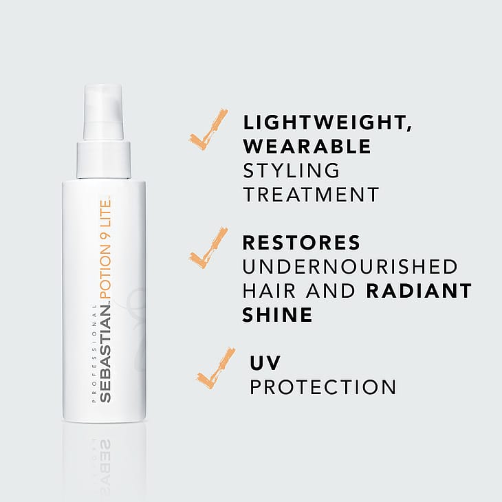 Muotoile helposti ja korjaa hiukset Sebastian Professional Potion 9 Lite -hoidolla. Tämä muotoiluhoito on suunniteltu kevyeen hoitoon ja muotoiluun erityisesi keskivahvoille ja ohuille hiuksille. Potion 9 Lite -suihke palauttaa aliravitut hiukset ja edistää helppohoitoisuutta. Sebastian-muotoiluhoito auttaa hiuksia saamaan takaisin joustavuutensa ja säteilevän kiillon.