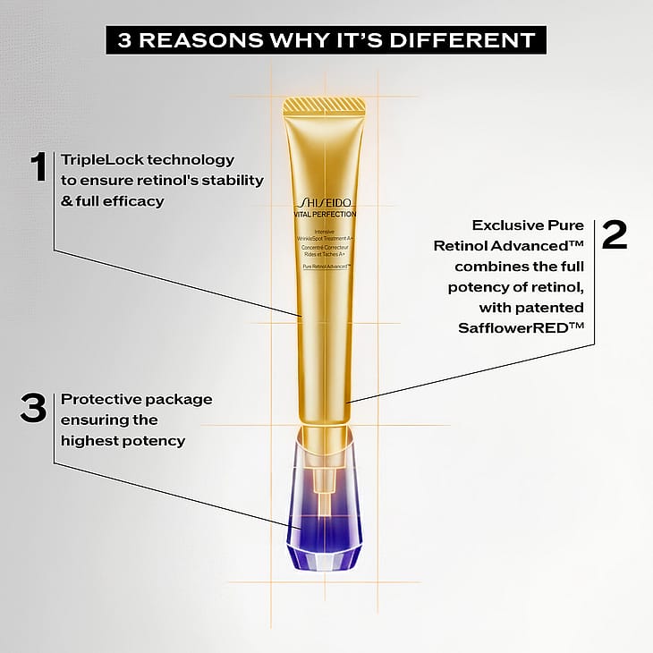 Shiseido esittelee tehokkaimman kohdennetun hoitonsa, joka on suunniteltu vastaamaan kypsän ihon erityistarpeita. Pure Retinol Advanced™ -teknologian ansiosta tämä innovatiivinen koostumus vaikuttaa tehokkaasti näkyviin ikääntymisen merkkeihin: syviin ryppyihin, tummiin läiskiin ja ihon kiinteyden heikkenemiseen.