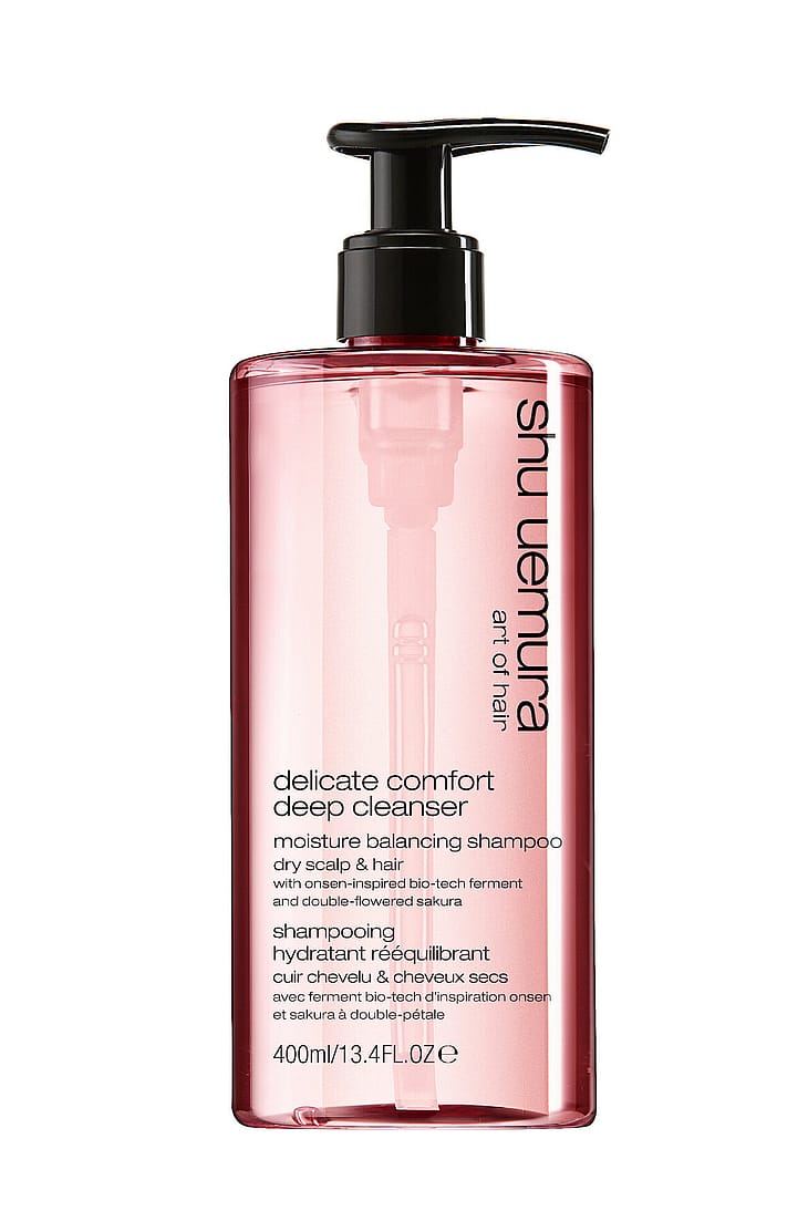Shu Uemura Art of Hair Deep Cleanser Delicate Comfort -shampoo, joka sisältää onsenin inspiroimia bioteknisiä fermenttejä ja japanilaista sakura-kukkaa, joka tunnetaan uudistuksen symbolina, puhdistaa tehokkaasti hiuspohjan ja hiukset poistaakseen ylimääräistä talia ja saastepartikkeleita, pysyen samalla hellävaraisena hiuspohjalle. Jättää hiuspohjan tuntumaan hoidetulta ja tasapainoiselta sekä hiukset kosteutetuilta. silikoniton, luonnollista tuntua varten. Sopii herkälle hiuspohjalle.