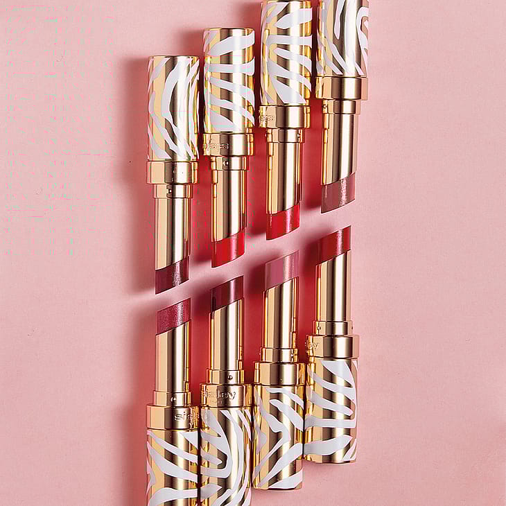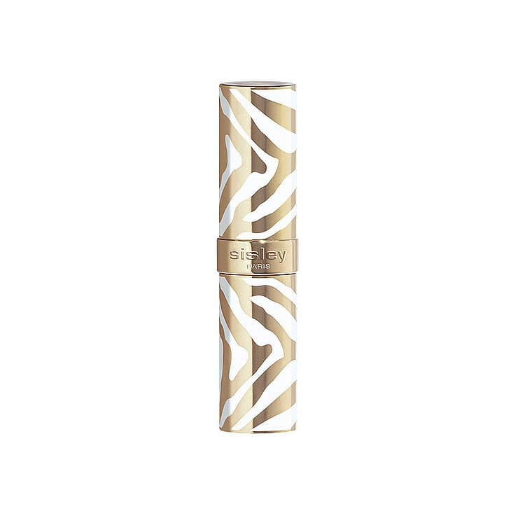 Sisleymäinen kotelo on koristeltu valkoisilla ja kultaisilla seepraraidoilla, kuten Le Phyto-Rouge -kokoelmassa.