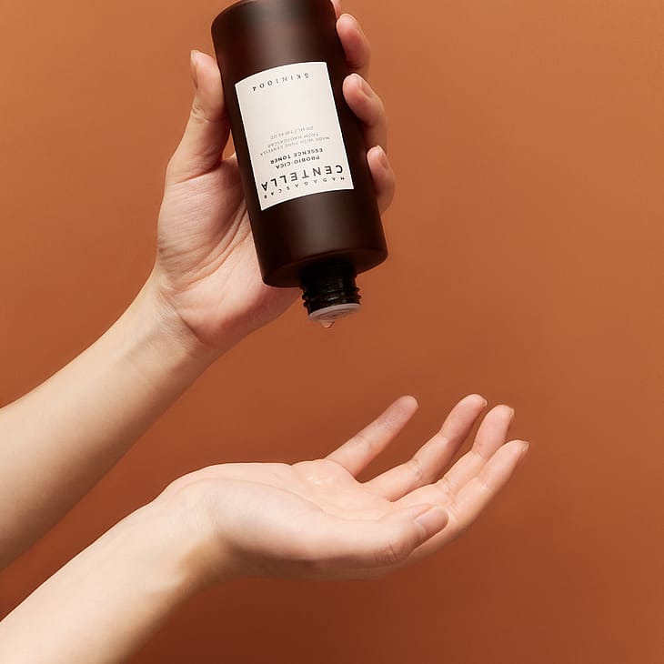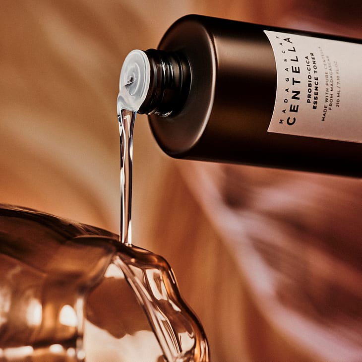 Runsas essence-toner, joka sisältää fermentoitua centellaa, 5 hyaluronihappoa ja ceramide NP:tä, rauhoittaa ja kosteuttaa ihoa.