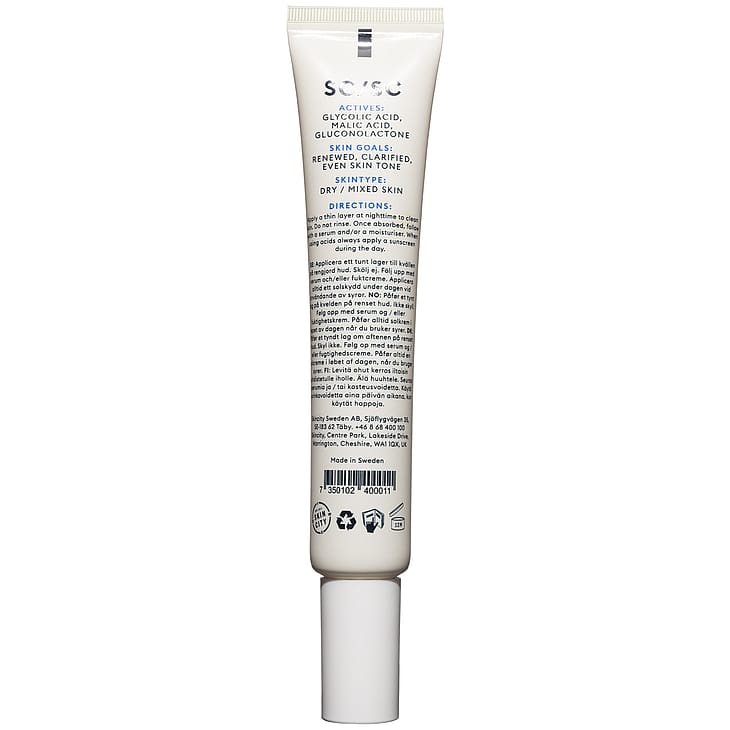 Levitä ohut kerros kuivalle ja puhdistetulle iholle, mieluiten iltaisin. Anna imeytyä ihoon ja levitä iholle sitten tiiviste ja/tai kosteuttava voide. Ei huuhdella pois. Totuta ihosi kuorintaan levittämällä tuotetta kerran viikossa sen mukaan, onko sinulla herkkä vai kestävä iho. Lisää sitten käyttöä vähitellen 2-3 kertaan viikossa tarpeidesi ja ihon kunnon mukaan.