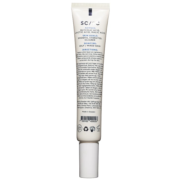 Smoothing Treatment on 5 % AHA-happoja ja 5 % PHA-happoja sisältävä kuoriva cocktail, joka uudistaa ja tasoittaa ihoa. Glykolihappo, maitohappo ja omenahappo (AHA) toimivat yhdessä tehostaen ihon luonnollista kuoriutumisprosessia, kun taas PHA-happo (glukonolaktoni) ja ihon luonnolliset kosteuttajat (NMF) varmistavat ihon syväkosteutuksen. Koostumus sisältää allantoiinia, bisabololia, centella asiatica -kasviuutetta, lakritsinjuurta ja keramideja, jotka rauhoittavat ihoa ja auttavat vähentämään hyperpigmentaatiota, jolloin ihosta tulee tasaisempi ja kirkkaampi ja se saa tervettä hehkua. Kevyt koostumus sopii normaalille ja rasvaiselle iholle. pH-arvo: noin 3,8. Kuorinta 5 % AHA + 5 % PHA Uudistaa ja tasoittaa ihonsävyä ja ihon rakennetta. Käytä 1-3 kertaa viikossa.
