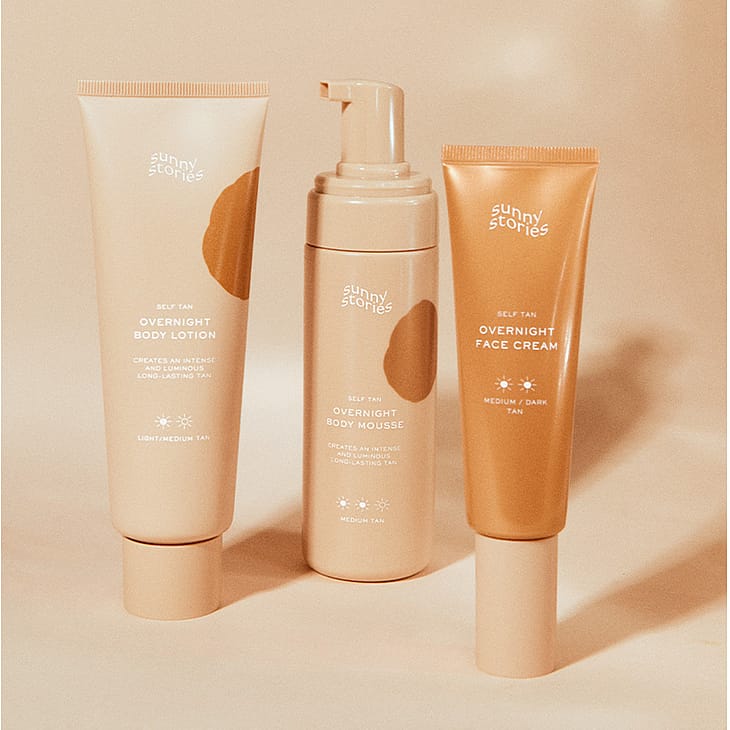 Sunny Storiesin overnight body mousse kuuluu overnight tan -sarjaamme, mikä tarkoittaa, että itseruskettava tuote vaikuttaa yön aikana. Aurinkojen määrä pakkauksissamme kertoo itseruskettavien tuotteidemme voimakkuudesta. Sunny Storiesin overnight-tuotteita voidaan käyttää, kunnes haluttu sävy on saavutettu, ja niitä voidaan käyttää viikoittain. Nyt on helppoa luoda päivettynyt iho omassa kylpyhuoneessa ja kuvitella olevansa hetken lämpimämmillä leveysasteilla.