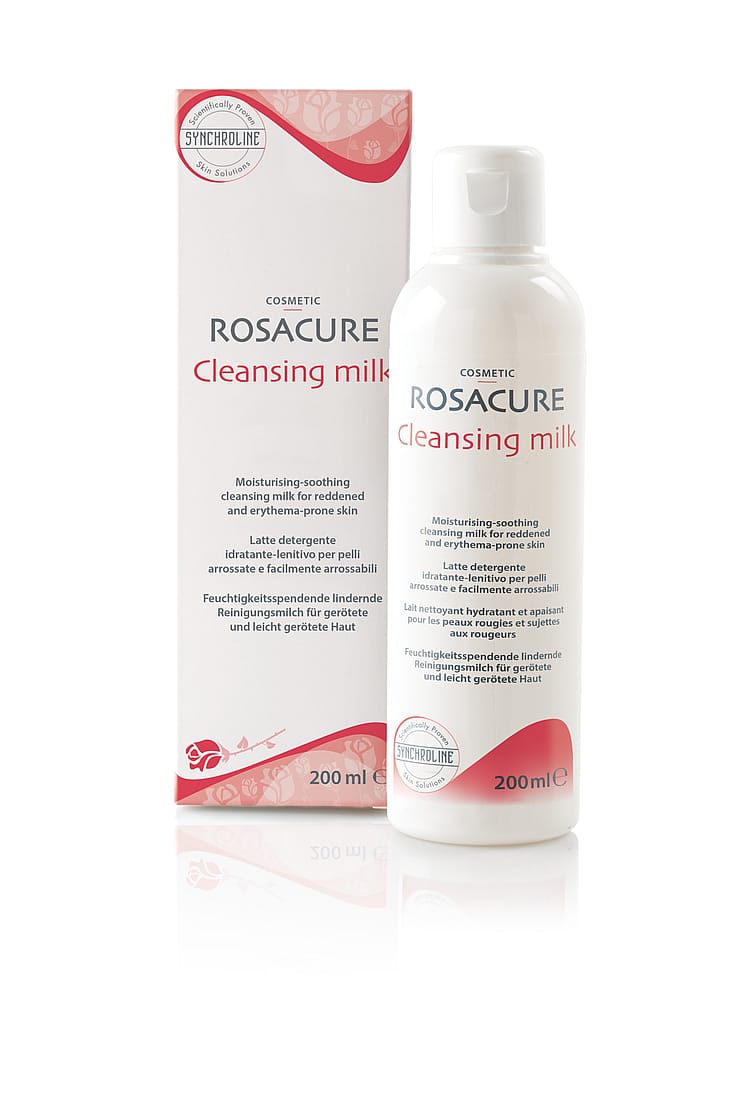 Rosacure Cleansing Milk on mieto vesipohjainen puhdistusmaito, joka puhdistaa ympäristösaasteet, lian ja meikin iholta tehokkaasti mutta erittäin hellävaraisesti ihoa ärsyttämättä. Pakkauskoko: 200 mlRuusufinni (acne rosacea) on krooninen ihottuma, jolle tunnusomaista on punoitukseen taipuvainen iho, pintaverisuonien laajeneminen ja/tai ihon tulehdusreaktiot. Tyypillisesti oireita esiintyy kasvojen keskiosissa. Iho on usein normaali tai pintakuiva, mutta ruusufinniä voi esiintyä myös rasvoittuvassa ihossa. Ruusufinnin aiheuttajaa ei tunneta, ja sitä hoidetaan ensisijaisesti oireita lievittämällä ja oireiden leviämistä hillitsemällä. Merkittävimmät ruusufinniä pahentavat tekijät ovat UV-säteily, verenkiertoa kiihdyttävä ruokavalio (kuumat juomat, voimakkaat mausteet) ja liikunta. Oireita voivat pahentaa myös muut ympäristötekijät (esimerkiksi stressi). ROSACURE® on sarja lääkintälaitteiksi luokiteltuja tuotteita, joilla on hyvin dokumentoitu vaikutus punoitusta ja pintaverisuonien laajenemista aiheuttavaan ruusufinniin. Käyttöaika on tavallisesti vähintään 30–60 päivää.