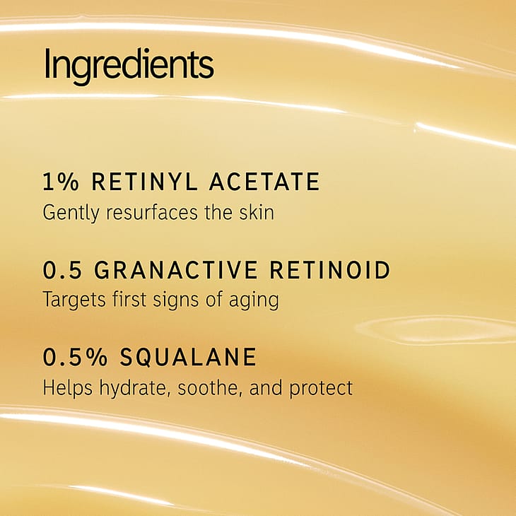 Ehdoton ainesosa ihon uudistumiseen. A-vitamiinista peräisin oleva Retinoli on todettu hyväksi ihon uudistumiselle ja se auttaa häivyttämään ikääntymisen merkkejä. Hienoja juonteita ja ryppyjä häivyttävä seerumi vapautuu hitaasti, mikä pienentää ihoärsytystä. Lisäksi se kirkastaa ihoa ja tasoittaa ihon sävyä ja antaa iholle kirkkaamman, tasaisemman rakenteen.