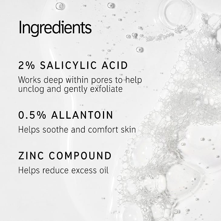 Puhdistusaine on tarpeeksi hellävaraista päivittäiseen käyttöön, ja sen kosteuttava, kuoriva geeli auttaa puhdistamaan huokosia sekä poistamaan likaa, saasteita ja ylimääräistä öljyä, jättäen ihon syväpuhdistetuksi ja kirkastuneeksi. Pääasiallinen vaikuttava aine, salisyylihappo (BHA), tukee ihon luonnollista kuorimisprosessia ja auttaa puhdistamaan tukkeutuneet huokoset tehden niistä vähemmän näkyviä. Sinkkikomponentin lisäys vähentää ihon pinnalla olevaa ylimääräistä öljyä, kun taas allantoiini rauhoittaa ja lievittää ihoärsytystä, erityisesti epäpuhtauksiin taipuvaisella iholla.