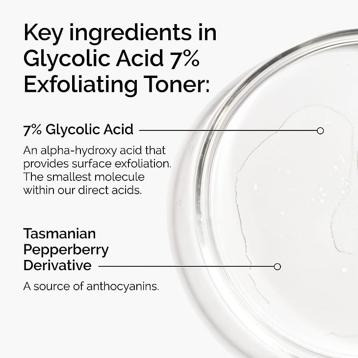 Koostumus sisältää Tasmanian pippurin johdannaisen, joka vähentää ihoärsytystä jota voi esiintyä happoja käytettäessä. Tämä johdannainen on kasvialkuperää jonka takia tuotteen väri vaihtelee riippuen eri vuodenajoista, koostumuksen väri voi myös vaihdella eri valmistusvaiheissa. Koostumus sisältää myös ginsengia ja aloe veraa jotka antavat iholle välittömän hehkun sekä sisältävät ihoa rauhoittavia ominaisuuksia. Tuotteen pH-arvo on n. 3,6. Glykolihapolla on pKa 3,6, joka kertoo sen happovakion. pKa, eli happovakio on tärkein näkökohta happoja valmistaessa, koska kun pKa on lähellä pH:ta, saavutetaan ideaali tasapaino suolan ja happamuuden välillä. Tämä taas mahdollistaa hapon maksimaalisen tehon tuotteessa, sekä vähentää ihoärsytyksen riskiä. Tuotetta ei saa käyttää herkälle, hilseilevälle tai rikkinäiselle iholle. Varoitus: Tuote sisältää alfahydroksihappoa (AHA), joka voi lisätä ihon herkkyyttä auringolle. Käytä aurinkotuotteita joissa SPF jos olet auringossa. Käytä tuotetta vain ohjeiden mukaan. Älä ylitä annettuja suositeltavia käyttömääriä. Vegaani.
