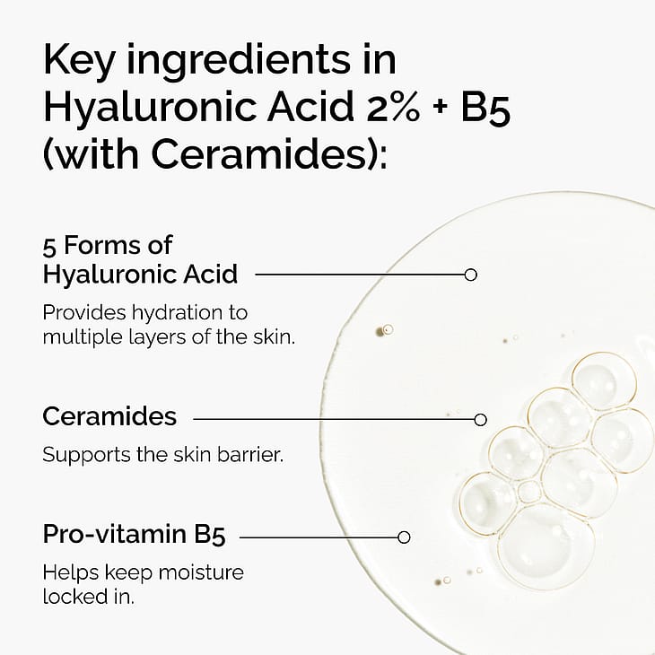 Hyaluronic Acid 2% + B5 tarjoaa välittömän täyteläisen kosteutuksen, joka tekee ihosta pehmeämmän, sileämmän ja terveemmän näköisen. Kevyt koostumus täyttää ihon kosteustasot koko päivän ajan ja auttaa ihoa säilyttämään kosteuden, tehden kuivasta ihosta kosteutetun ja täyteläisemmän. Hyaluronic Acid 2% + B5 edistää myös ihon kimmoisuutta ja elastisuutta samalla kun se minimoi hienojen kuivuudesta johtuvien juonteiden ulkonäköä.